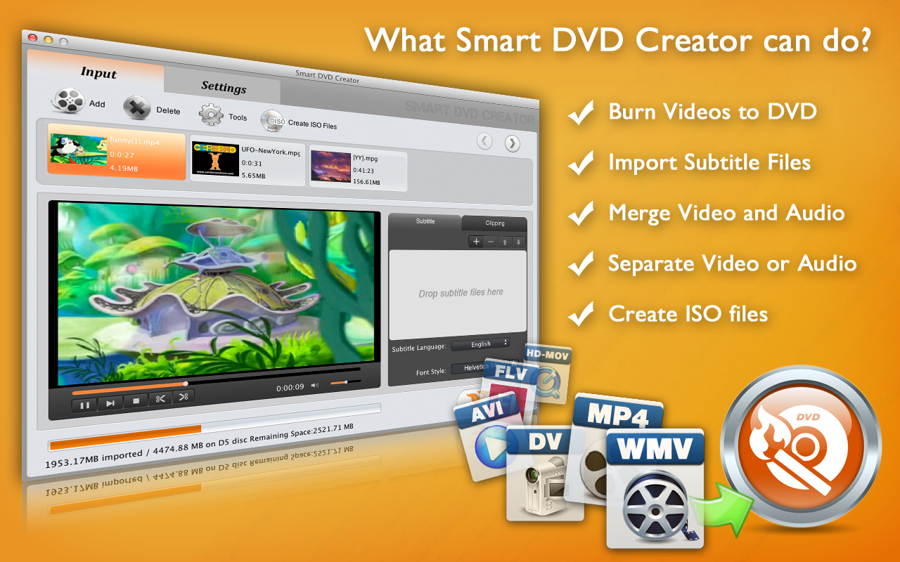 Smart DVD Creator is a powerful and easy-to-use DVD maker program. It can easily burn videos to DVD or create ISO files. All popular video formats are supported: MP4, AVI, MKV, MPG, MPEG, WMV, MOV, FLV, AVCHD… Enjoy your DVD movie anywhere!