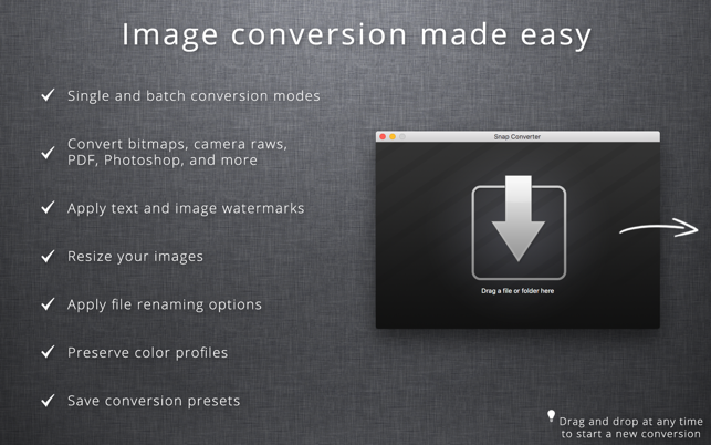 ApplicationsConverterGraphics & DesignSnap Snap Converter 3.0.1 by mac torrent May 1, 2020 May 1, 2020 ( Snap Converter 3.0.1 )Loading... Download Snap Converter makes image and icon conversion easy. Just drag and drop to convert between many popular graphic formats. Convert bitmap graphics, Mac and Windows icons, Camera Raw images, Photoshop documents, and many other formats. You can even create multi-image Mac icon files from a single image. Need to convert a lot of images? Snap Converter allow you to convert multiple images in batch mode. Just drag and drop a folder or multiple image files to convert all the images at once. Additional Features • Resize images by percentage, longest side, shortest side, absolute size, fixed width or height, or max width and height • Preserve EXIF data and other image metadata for JPEG and TIFF output • Add text and image watermarks • Bulk rename files in batch mode • Optimize PNG file size • Adjust JPEG image quality • Preserve color profiles • Convert to sRGB for JPG, PNG, and TIFF output • Process subfolders and preserve output directory structure • Use batch mode copy option for extracting images from folders • Output Mac OS X icon (.icns) files (512×512, 256×256, 128×128, 32×32, and 16×16) Supported Image Formats ——————————————————————————————————————————————— Read / Write • JPEG (.jpg, .jpeg, .jpg) • PNG (.png) • BMP (.bmp) • GIF (.gif) • TIFF (.tif, .tiff) • JPEG 2000 (.jp2, .jpx, .j2k) • Mac OS X Icon (.icns) Read Only • TARGA (.tga) • Windows Icon (.ico) • Windows Cursor (.cur) • Portable Document Format (.pdf) • Encapsulated PostScript (.eps) • Photoshop Document (.psd) • Adobe Raw (.dng) † • Canon Raw (.crw) † • Canon Raw 2 (.cr2) † • Nikon Raw (.nef) † • Minolta Raw (.mrw) † • Sony Raw (.arw) † • Olympus Raw (.orf) † • Panasonic Raw (.rw2) † † For Camera Raw formats, see the supported camera model information below Supported Camera Models • For Camera Raw types (.arw, .cr2, etc.), please view the following page to see if Snap Converter supports your camera model: https://www.snapconverter.com/file_types Compatibility: OS X 10.6.6 or later, 64-bit processorHomepage https://apps.apple.com/app/snap-converter/id431094796 Screenshots Name: Snap_Converter_3.0.1_MAS__HCiSO_Mactorrents.io.dmg Size: 7 M Files Snap_Converter_3.0.1_MAS__HCiSO_Mactorrents.io.dmg[7 MB] Download Related Posts:Exposure Software Snap Art 4.1.4.0CSV Converter Pro 2.2Video GIF converter 2.5.6Tipard Blu-ray Converter 10.0.30 Download Convertermac torrentmac torrentsSnap 0 comment TwitterRedditEmail mac torrent MacTorrent - Torrents in Mac. Free Apps, Games & Plugins. Apple Final Cut Pro & Logic Pro X, Adobe Photoshop, Microsoft Office, Pixel Film Studios, previous post SketchUp Pro 2020.1 v20.1.228 next post Serial Box 05.2020