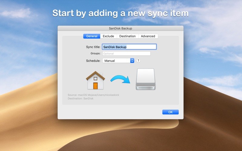 You can create as many sync items as you need and customize each one individually. A sync item mainly consists of two folders: a source and a destination. You can choose any two folders reachable in the Finder: they can be located on your Mac, on an external drive, like a USB stick, or even on a remote server. Among the possible options you will find: