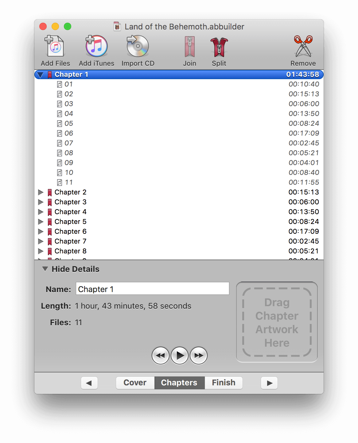 Audiobook Builder makes it easy to turn your audio CDs, MP3s, M4As, and other audio files into audiobooks for your iPhone, iPod or iPad. Join audio, create enhanced chapter stops, adjust quality settings and let Audiobook Builder handle the rest. When it finishes you get one or a few audiobook tracks in iTunes® instead of hundreds or even thousands of music tracks!
