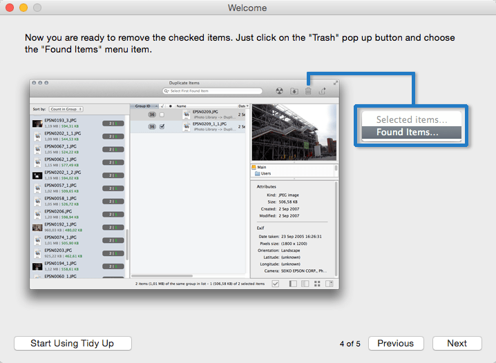 With Tidy Up you can search for duplicate files and packages by the owner application, content, type, creator, extension, time modified, time created, name, label, visibility, and date/age. You can also search by the tag, duration, and bit installments of MP3 and AAC sound files and EXIF metadata; search the contents of the Photos, iPhoto, Aperture, iTunes, iPod databases, and Mail mailboxes; and synchronize deletions with iPhoto, Mail, and iTunes.