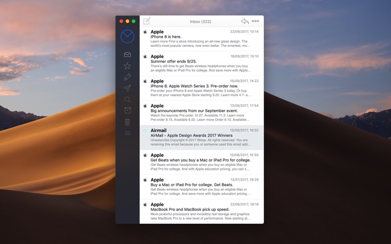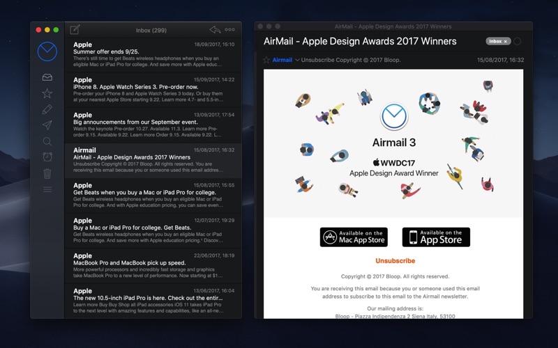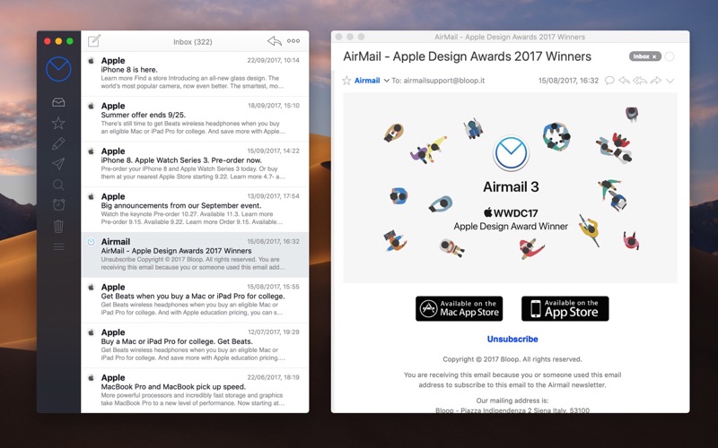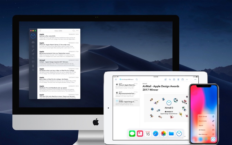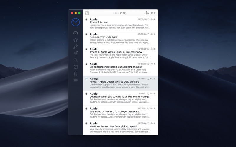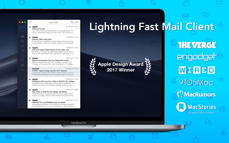 Airmail 5 is a new mail client designed with performance and intuitive interaction in mind optimized for macOS High Sierra! Support for iCloud™, MS Exchange, Gmail™, Google™ Apps, IMAP, POP3, Yahoo!™, AOL™, Outlook.com™, Live.com™