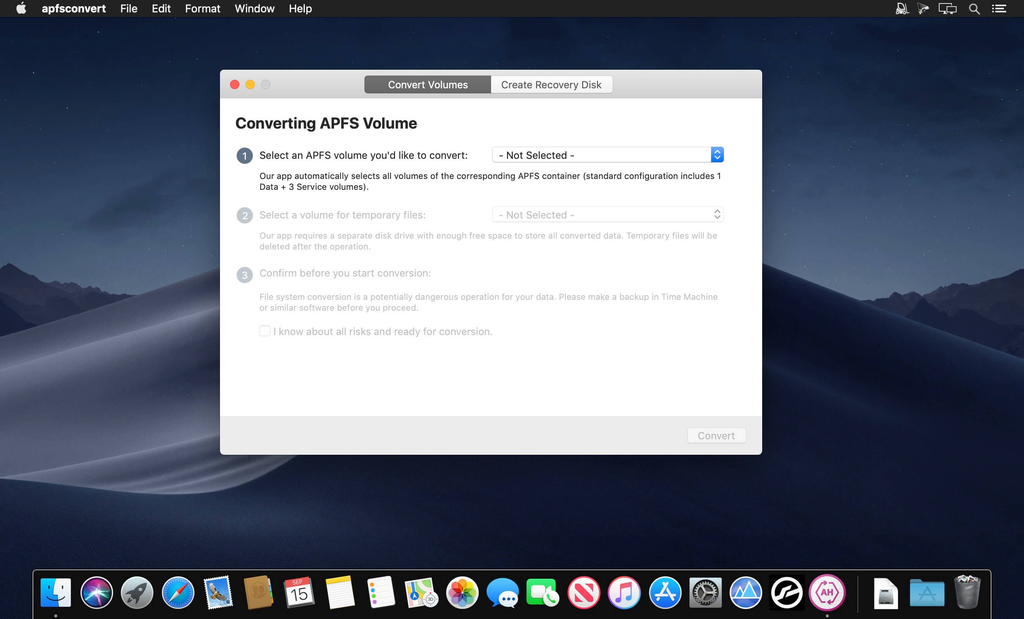 Facing limitations of APFS such as incompatibility with Time Machine for backups, incompatibility with FileVault 2 for drive encryption, inability to format Fusion drives, and more? APFS to HFS+ Converter by Paragon Software easily reverts to the old good HFS+ for your specific scenarios. Create recovery media to boot up your Mac and then convert the system volume.
