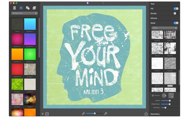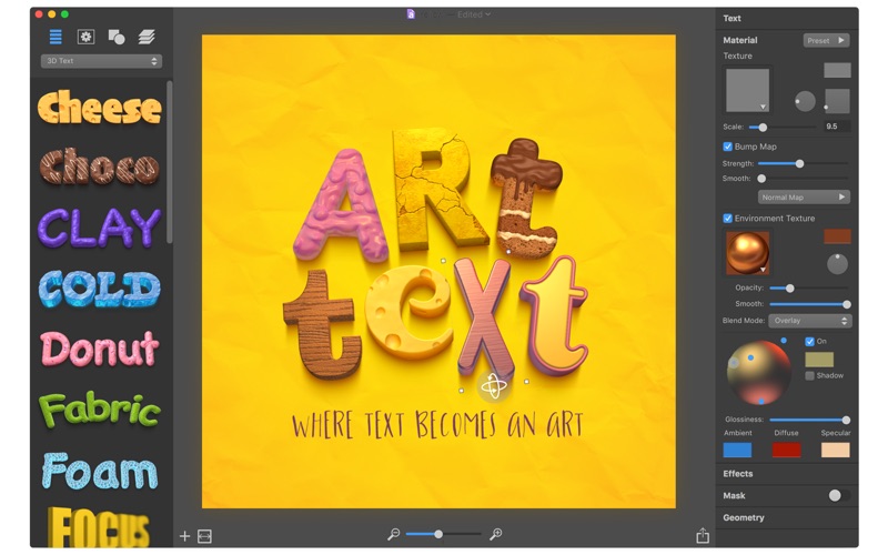 Graphic Design Software for Everyone. Art Text is graphic design software specifically tuned for lettering, typography, text mockups and various artistic text effects. Supplied with a great variety of ready to use styles and materials, selection of textures, icons, fonts and backgrounds, special designed effects and shape transformations, Art Text guarantees striking appearance of your badges, logos, cards, flyers and presentations.