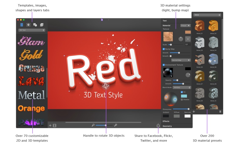 Art Text comes equipped with a wide selection of text styles, surface materials and effects. Unrestricted by any presets, your creativity will take flight with easily adjustable textures, surface bump maps, environment textures, light spots and shadows, and other settings to come up with new materials.