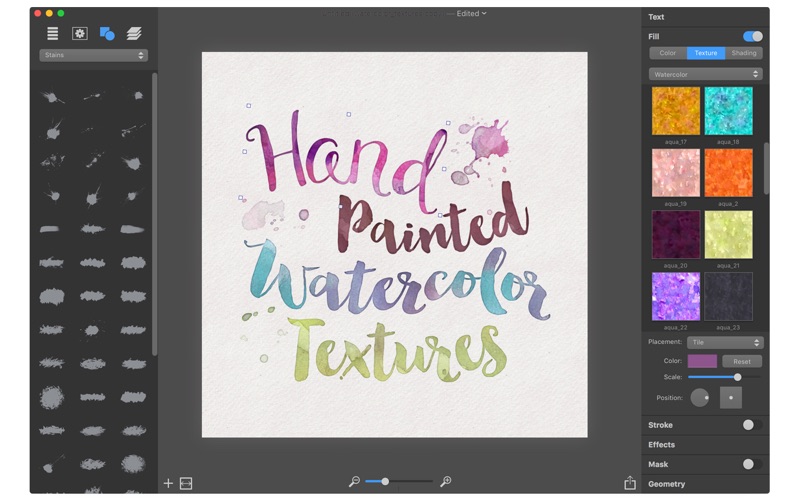 Art Text comes with a great variety of fills, distortion effects and object content to design highly realistic, hand painted, ink written and watercolor lettering art.