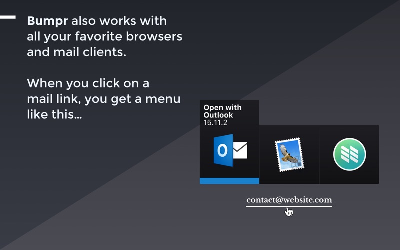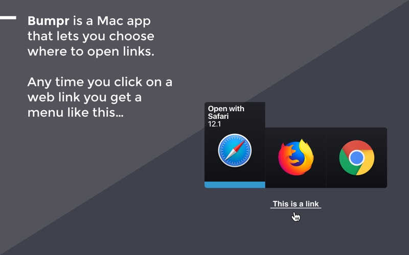Bumpr is a handy, beautiful Mac app that lets you choose where to open links. Anytime you click on a web link, a compact, elegant menu pops up right in place and lets you choose which browser to open that link with. Bumpr also works with mail links.