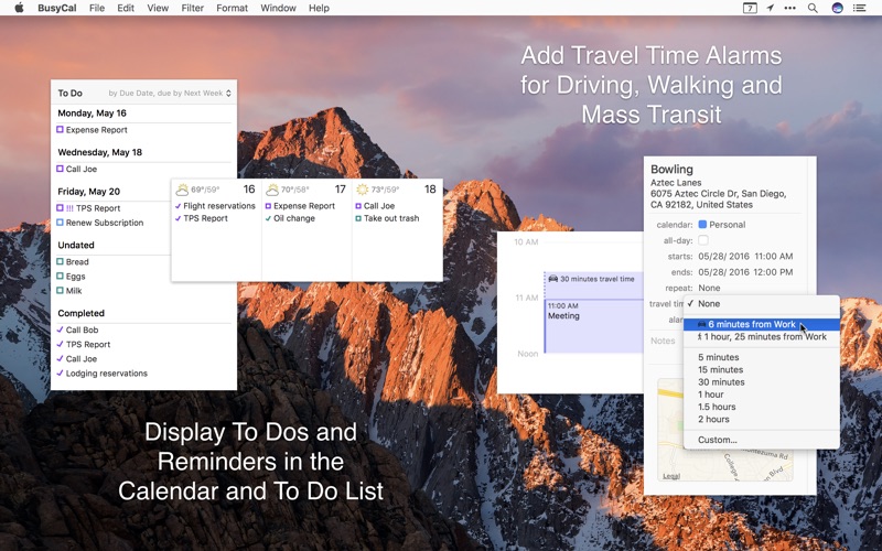 BusyCal allows you to block out time for walking, driving or taking mass transit to an event or location. You can set a fixed amount of travel time or determine it automatically using the integrated support for Location Services and Apple Maps. You can even receive alerts when it’s time to leave as traffic conditions change.