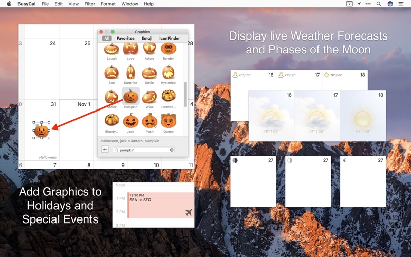 BusyCal lets you add graphics to your calendar to highlight holidays and special events. You can choose from the built-in Emoji and IconFinder images, or drag images from your desktop or web.