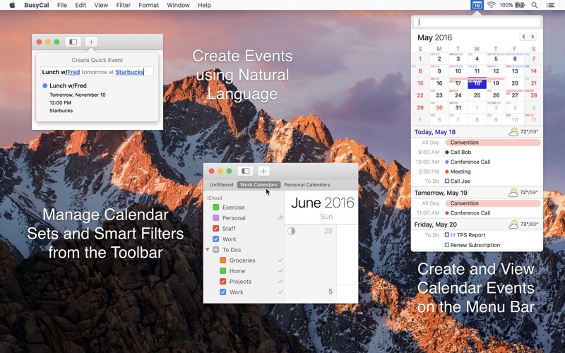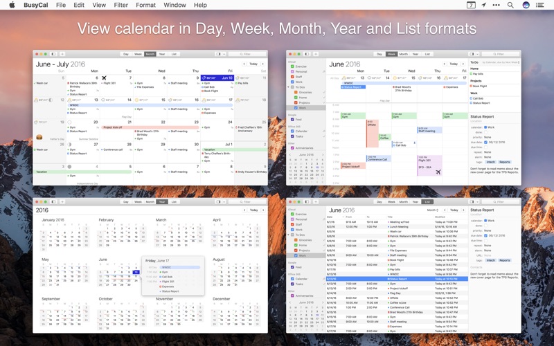 BusyCal 3 is the most powerful, flexible, reliable calendar app for macOS. It’s packed with innovative, time-saving features including customizable views, integrated to dos, travel time, maps, natural language input, weather, moons, graphics, tags and more.