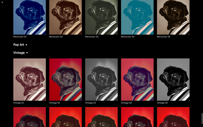CameraBag Pro is particularly great for anyone who needs to apply the same style to both photos and videos – especially with batch processing for large sets of media (including watermarks/branding, resizing, and cropping).