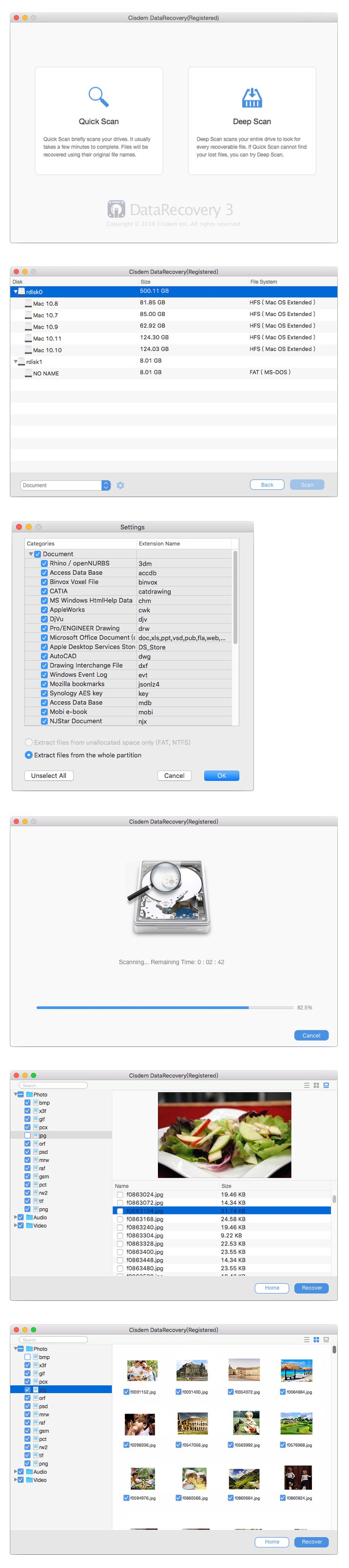 Cisdem Data Recovery, Using advanced scanning technology and directory restructuring algorithm, Cisdem Data Recovery for Mac can help you to recover lost valuable data. Cisdem Data Recovery, Using advanced scanning technology and directory restructuring algorithm, Cisdem Data Recovery for Mac can help you to recover lost valuable data documents, emails, videos, music, photos, and lost partitions from any Mac supported data storage media, including internal/external hard drives, USB drives, SD card, optical media, memory cards, digital cameras, mobile phone (iPhone not included), iPods etc.