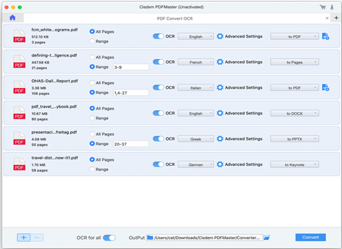 Cisdem PDFConverterOCR brings you OCR technology to convert any native PDF, scanned PDF, encrypted PDF, or image file to editable and searchable Word, Text, Excel, PPT, ePub, HTML, Text, RTFD, Pages, Keynote, or image document; as well as to digitize text in images (JPG, BMP, PNG, TIFF, GIF) while maintaining the original layout.