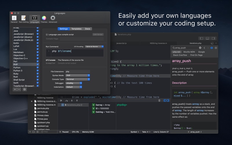 CodeRunner was built on the principle that you should be able to run your code instantly in any language. CodeRunner can run code in 23 languages out-of-the-box, and can be easily extended to support any other language. Adding a language is as easy as entering its terminal command.