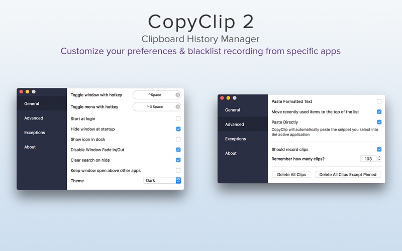 We’ve worked hard to make CopyClip 2 as simple and efficient as possible for you to use. We would love to hear your thoughts via email and make any improvements to future versions of this app. We intend to have an active development cycle powered by your feedback, love and support!