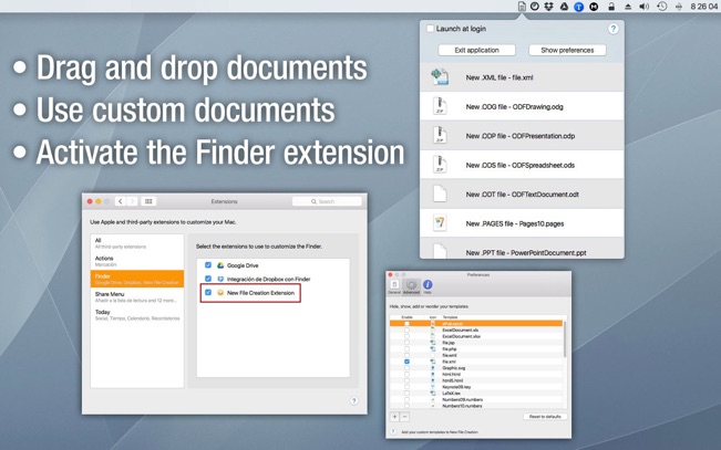 New File Creation is a small utility that allows you to do this: to have a group of default documents or to configure your own set of documents and be able to drag them where you need to start quickly with that document. As easy as drag and drop. In addition, New File Creation has an extension for OS X that allows you, using the context menu by clicking anywhere, to create directly a document of your choice in any location at glance: this can be a blank document or template based on a document you’ve created in any application!. New File Creation eliminates tedious tasks like opening the application, create a new document and move it where you need it: all these steps at a time and you can get to work. And … with your own templates, any application, all gathered in one app! New feature: Brand new Touch bar support!!! Get your templates at glance in your touch bar, swipe right or left and touch you template to create a new one, touch bar is available on Mac OS 10.12.2 and above. If you like this FREE application please consider a little donation on this bitcoin address to support future developments: 1B3n2ZLR4dNeqhvLKtWeYEThqoyZTJDQwD