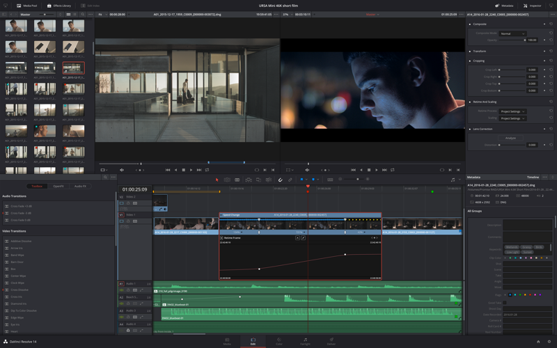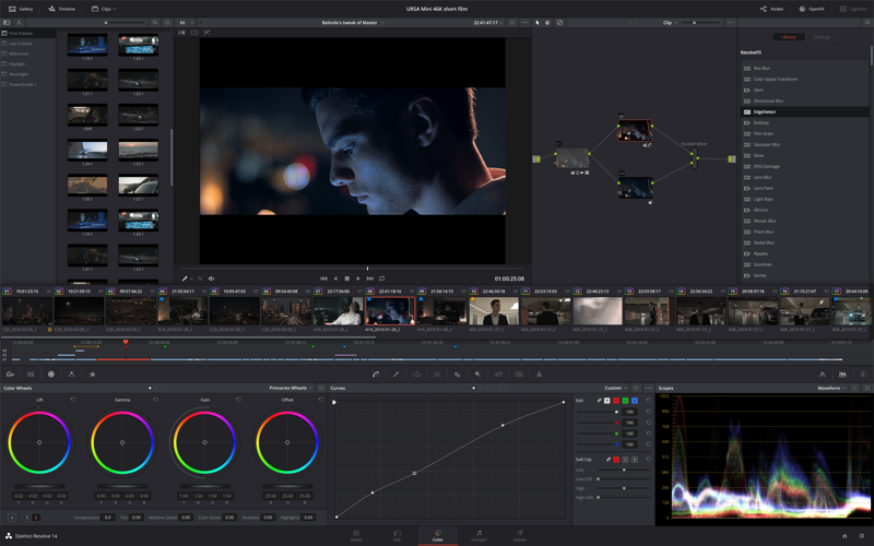 DaVinci Resolve includes everything professional editors need to cut blockbuster films, television shows, and commercials. It’s perfect for both offline and online editing. The high performance playback engine makes editing and trimming incredibly fast, even for processor intensive formats such as H.264 and RAW.
