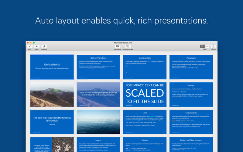 Deckset is a new, simple way to create presentations. Open your favorite text editor, write down your thoughts, and Deckset will turn them into beautiful presentations. Focus on your ideas, not on designing slides.