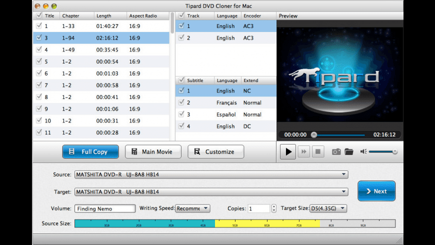 Tipard DVD Cloner for Mac not only copy DVD disc to DVD disc, but also can compress DVD-9 to DVD-5 with best quality. It can also help you backup DVD disc as ISO or DVD Folder, and copy your local ISO or DVD Folder to your DVD disc. What’s more, you can also select full copy, main movie, and customize to copy.