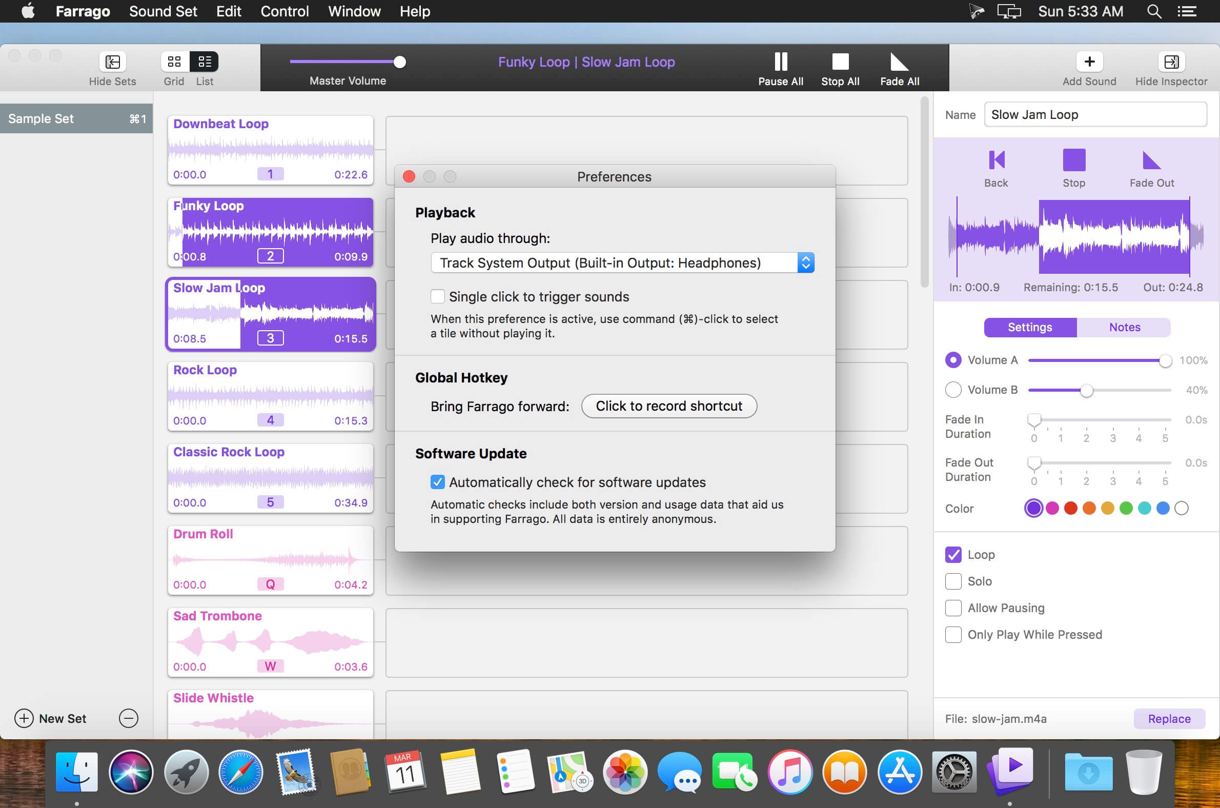 Global Access via Hotkeys: With Farrago’s user-definable Global Hotkey, you can pull the app forward, then use the in-app shortcuts to instantly trigger your desired audio.