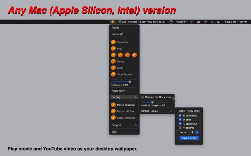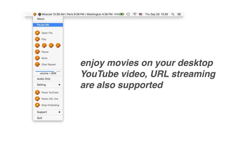 desktopCinema allows you to play videos on your desktop whether it is stored on your hard drive or streamed from the Internet. Your video replaces your desktop picture/wallpaper, so working and watching at the same time has never been easier. Our clean and simple controls let you easily pause and mute video or audio from the menu bar.
