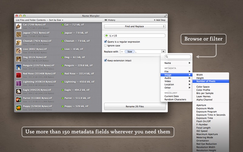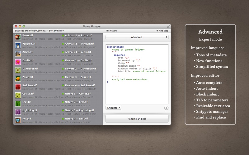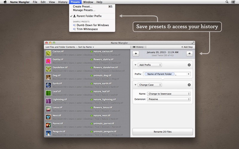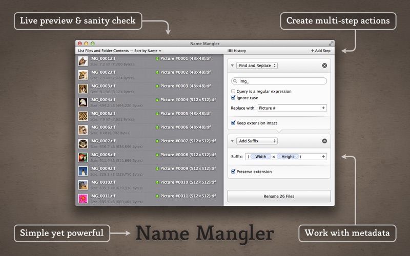 Web Site: https://manytricks.com/namemangler Mac App Store: https://itunes.apple.com/app/name-mangler-3/id603637384?mt=12