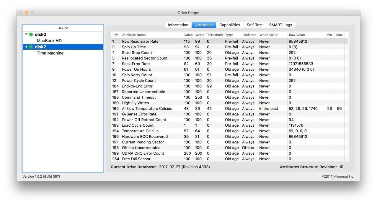 Typically, a drive will check it’s SMART attributes whenever it is convenient. With Drive Scope, you can manually trigger the drive’s internal tests to make sure the SMART data is as up-to-date as possible. Check how long since the last time the drive ran a test with the drive’s testing log.