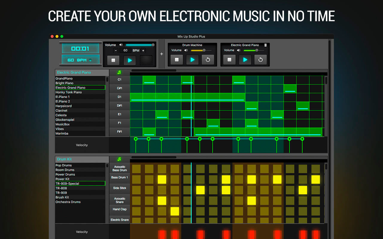 Mix Up Studio FEATURES: VARIETY OF INSTRUMENTS Pick an instrument and write its part in the sequencer, add other instrument if you like.