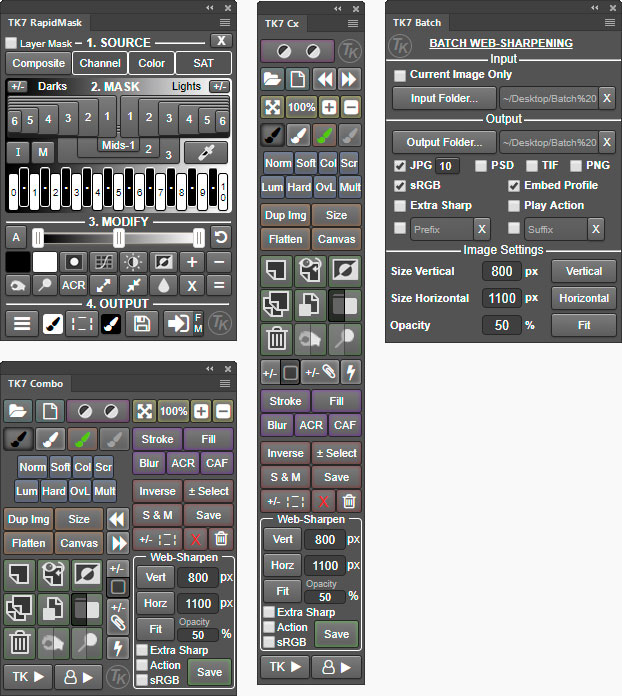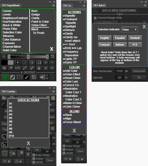 The TK7 panel is the newest release of the comprehensive panel for making luminosity masks and running Photoshop. It includes all the features of the previous V6 panel plus many new ones. Like its predecessor, the TK7 panel is modular, so users can configure it in whatever manner works best in their workspace. The Combo module even has two different arrangements to allow a new compact layout if that’s desired. (Sean Bagshaw has a video at the bottom of this page that shows how to do this.) TK panels are used worldwide and come pre-programmed with six common languages: English, Spanish, German, French, Italian, and Chinese. Users can choose the language they prefer.