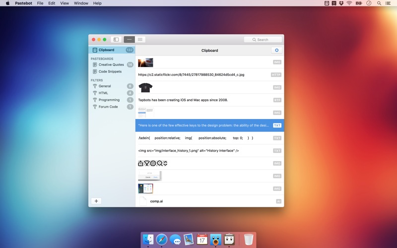Pastebot is there when you need it and invisible when you don’t. Quickly access your clippings from any app and search, preview, or filter clippings before pasting. You can even set the order of clippings to paste in sequence.
