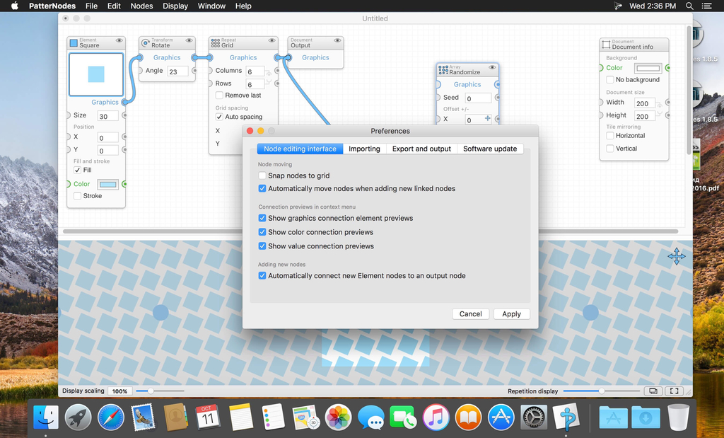 The resulting pattern tile is always shown in the bottom preview view, repeated and updating in real time with any changes, giving you instant feedback of what the end result will be. To make pattern creation easier PatterNodes also includes a lot of nodes that automatically perform common tedious tasks like repeating elements at the tile edges to make the pattern seamless, or randomizing different aspects (like color, position, rotation, etc.) of the elements in a pattern to give it a little more life. Finally, when you’re done you can simply copy the pattern tile into whatever illustration or graphics application you use, or export it either as vector graphics or a bitmap image file. Animations can be exported as GIF, QuickTime MOV or numbered PNG or JPG files