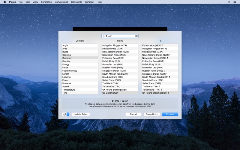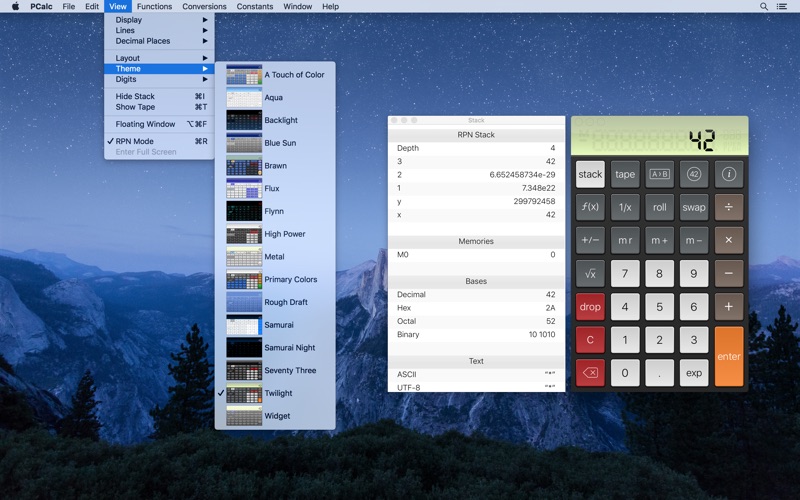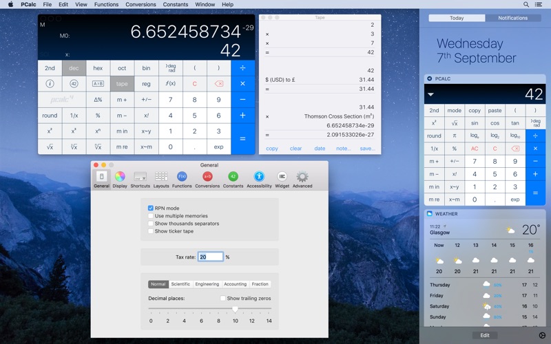 PCalc is the powerful choice for scientists, engineers, students, programmers, or indeed anybody looking for a feature rich calculator. It includes an optional RPN mode and multi-line display, a choice of button layouts, an extensive set of unit conversions and constants, a paper tape, multiple undo and redo, engineering and scientific notation, as well as support for hexadecimal, octal, and binary calculations.PCalc is ideal for scientists, engineers, students, programmers, or indeed anybody looking for a feature rich calculator.