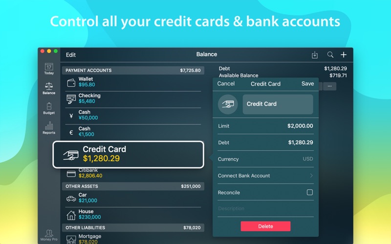 - Unlimited number of accounts in one place (checking, savings, credit card, etc).
