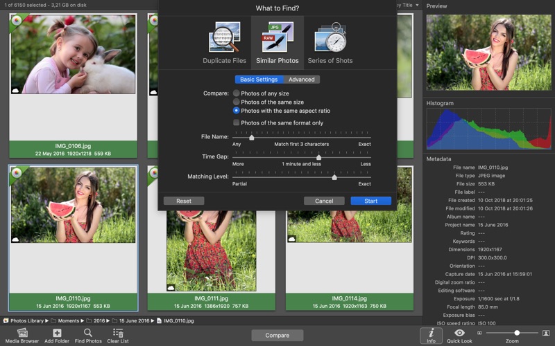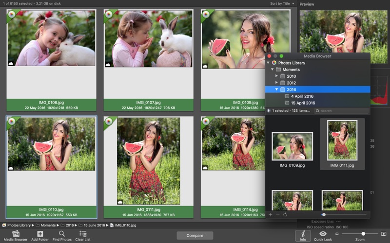 PhotoSweeper provides an up-to-date photo browser with such features as: fast loading of thumbnails, Quick Look preview, drag and drop support, showing paths, ratings, labels, etc. The “Image Info” panel shows more detailed information, including histogram and image metadata (EXIF, IPTC, etc.).