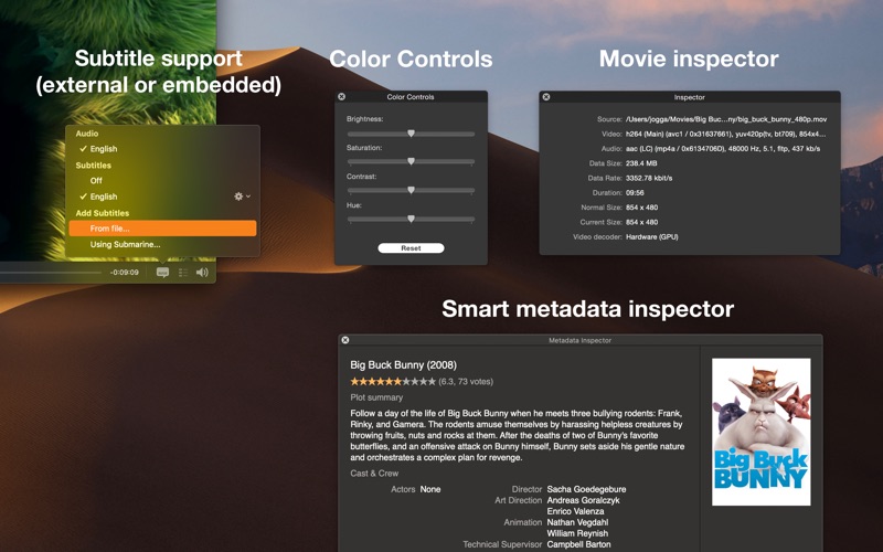 Automatically loads and displays embedded subtitles or subtitles from external files.