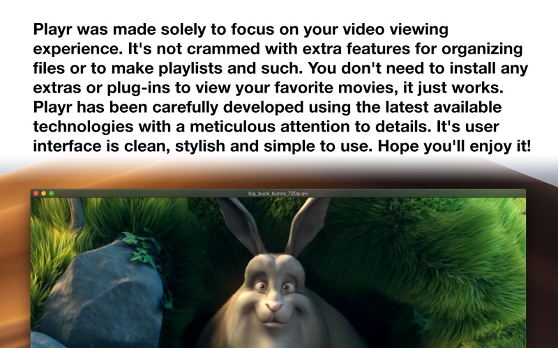 Playr was made solely to focus on your video viewing experience. It’s not crammed with extra features for organizing files or to make playlists and such. You don’t need to install any extras or plug-ins to view your favorite movies, it just works. Playr has been carefully developed using the latest available technologies with a meticulous attention to details. It’s user interface is clean, stylish and simple to use. Hope you’ll enjoy it!