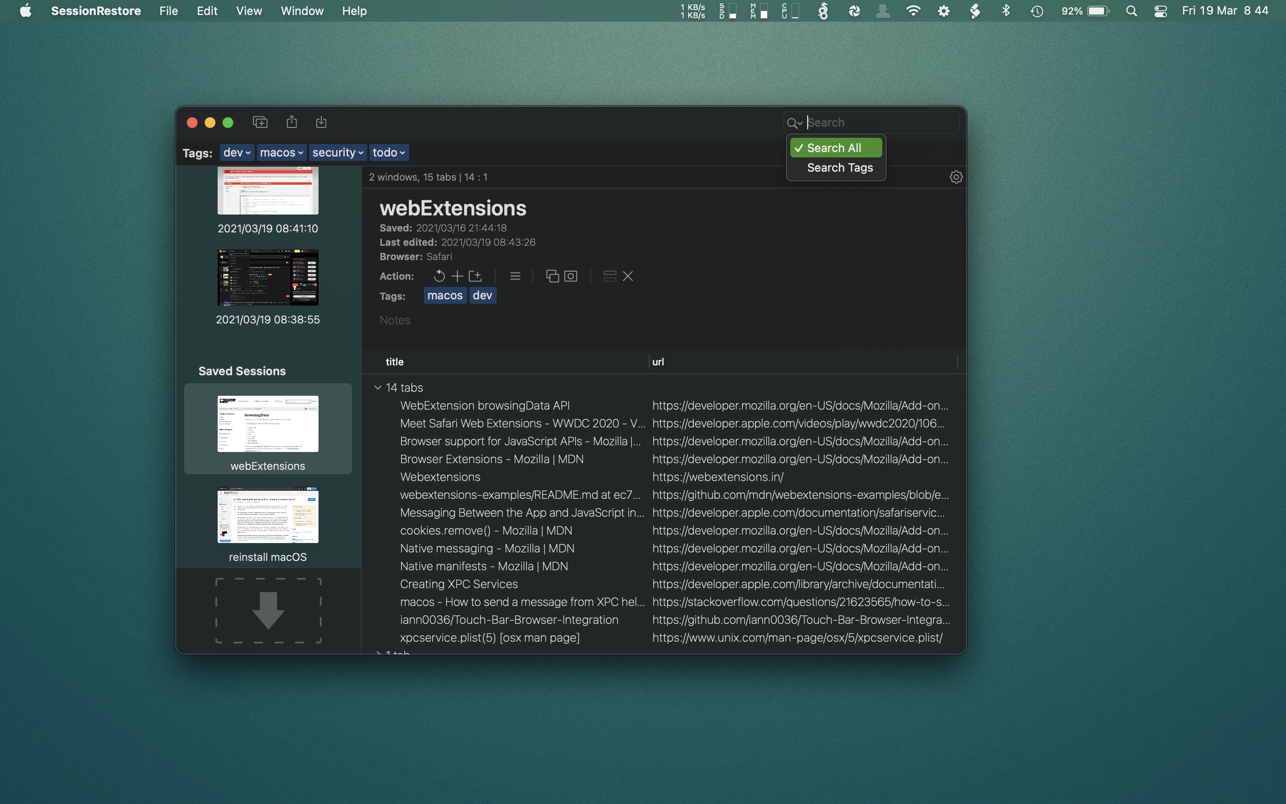Built with the latest technologies, and integrated right in to Safari as an Extension, SessionRestore can help streamline how you manage and recall important websites.