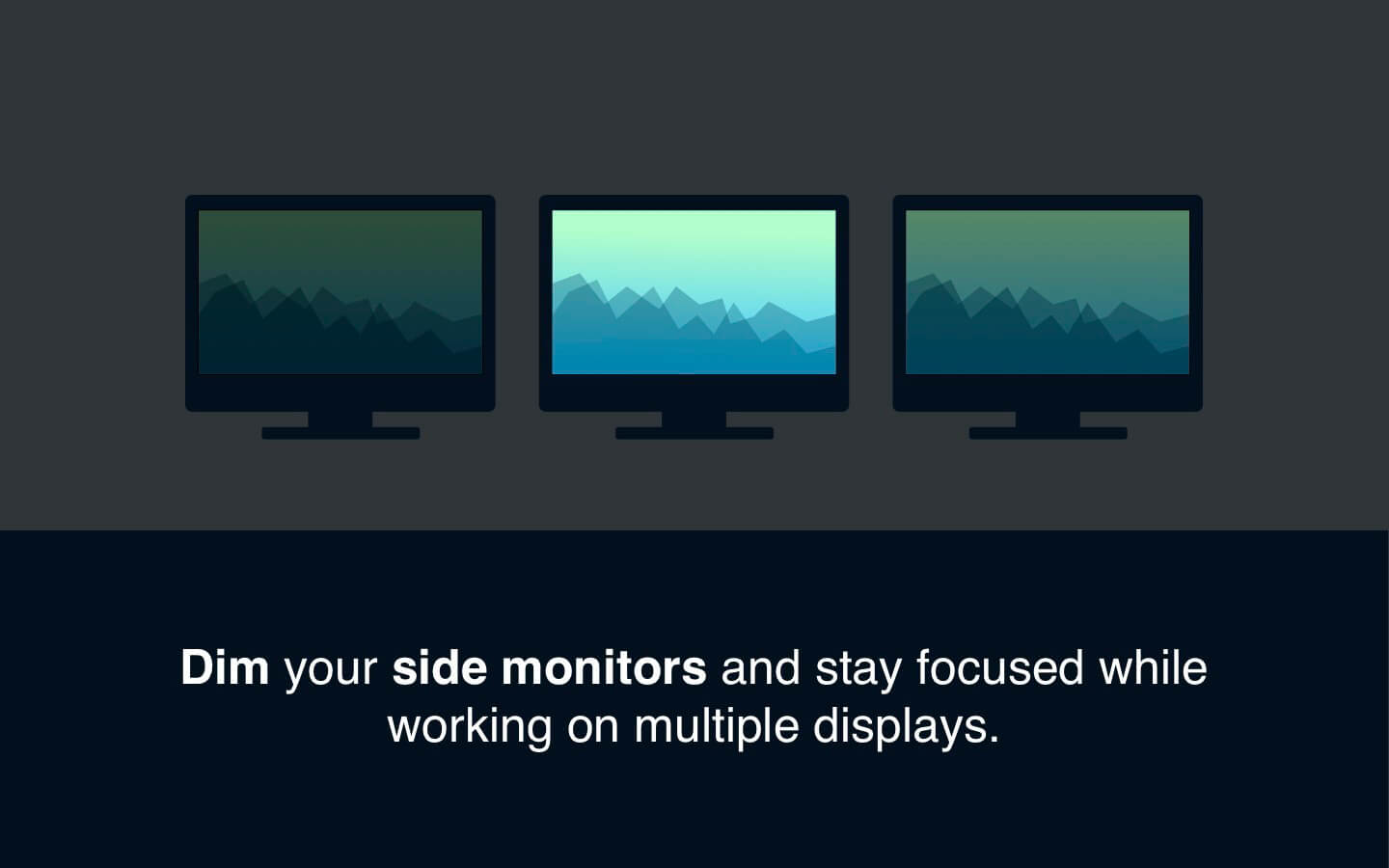 ScreenFocus dims your screens. You don’t have to click any button to dim a screen. It’s dimmed automatically when you move the cursor away. By default, only the side screens are dimmed. Of course, you can change it within the app menu.