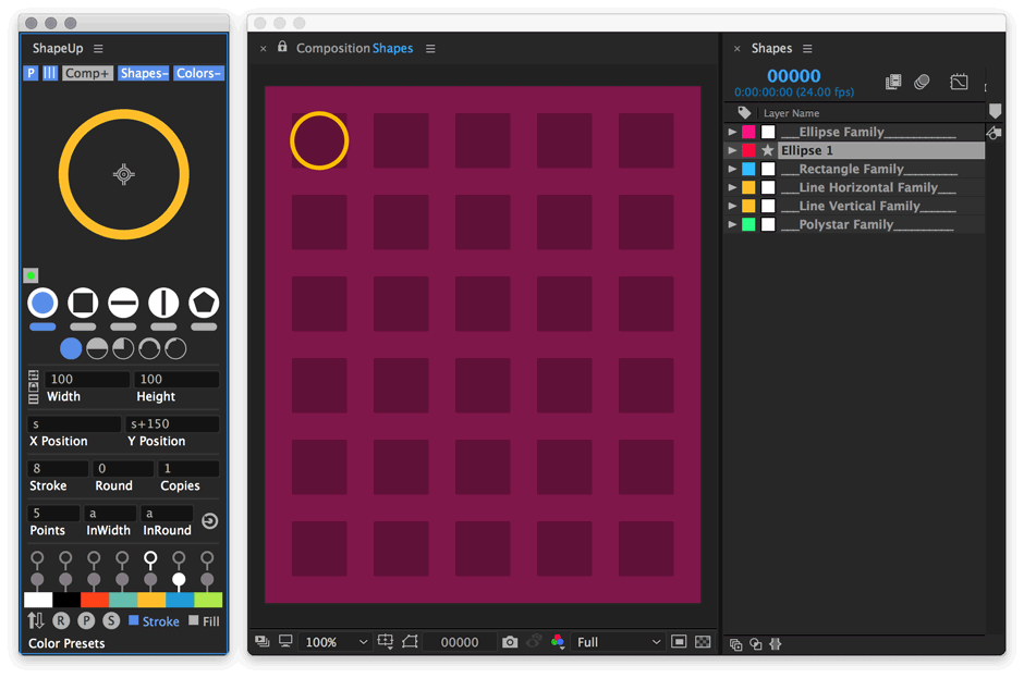 MAIN FEATURES Preview your shape & composition Five shape families to choose from: ellipse, rectangle, horizontal lines, vertical lines, polygons + stars 5-6 sub shapes each Quickly set the anchor position and alignment to your comp within the preview Create shapes at the top / bottom of your layer stack or above / below a selected layer Set size, position, stroke width, rounding, amount of copies and points, inner width, inner rounding for polygons/stars Input fields: Use tokens to utilise the comp size, alignment, position of selected layers, grid spacing Toggle stroke & fill on/off Set colors