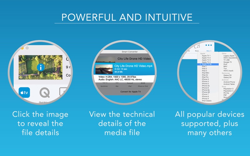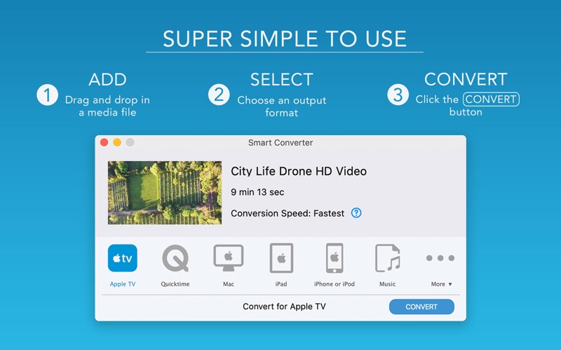 The fastest video converter with movie and TV show metadata, subtitles, folder monitoring and batch conversions. Smart Converter Pro has it all. It’s so easy to use – just drag your video or audio files onto Smart Converter Pro, select an output preset and convert. Smart Converter Pro analyses your files and only converts the bits that need to be converted. This means less waiting and top quality conversions.