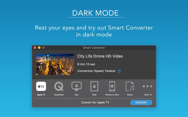 Smart Converter Pro only converts the parts of your movie that need it and leaves the rest alone. This makes Smart Converter Pro faster that every other converter while maintaining the highest possible quality video an audio in the converted movie.