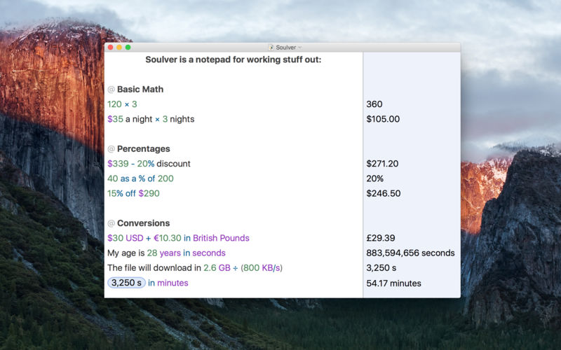 Soulver 3 helps you do quick calculations and work things out. Use Soulver to play around with numbers, do “back of the envelope” calculations, and solve day-to-day problems.