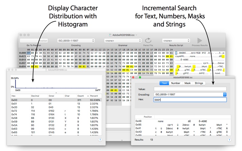 Synalyze It! Pro is a simple-to-use hex editor which will allow you to easily edit and analyze binary files of any size. It features enhanced support for many character encodings and enables you to interactively define “grammars” for various file formats to speed up analysis and reduce manual decoding of files. Incremental search for strings and numbers, printing and other features make it a quite powerful tool.