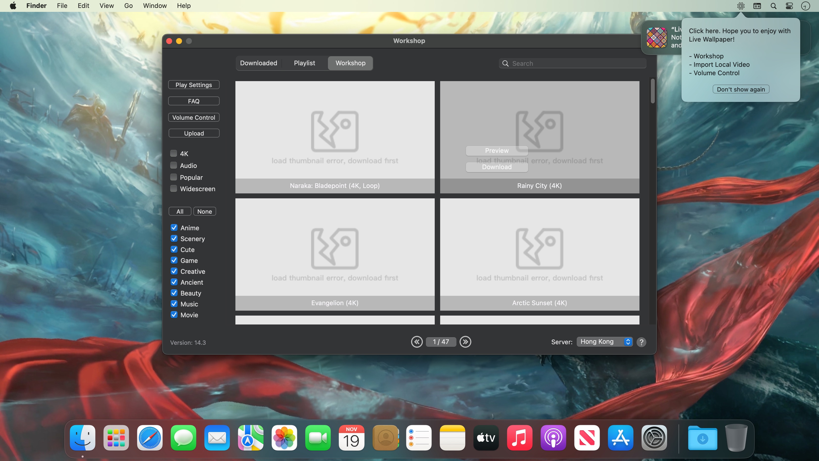 Dynamic Wallpaper Engine allows you to use live wallpapers on your desktop/screensaver. It provides thousands of live wallpapers in the Workshop while taking as little system resources as possible. It’s the Wallpaper Engine for Mac.