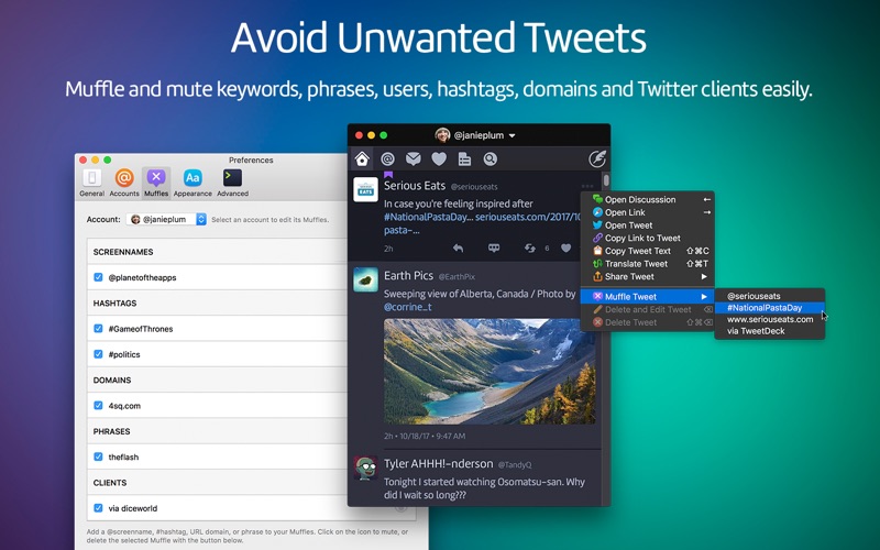 Designed for macOS – Twitterrific feels right at home on the Mac, with support for Notification Center, Retina displays, built-in sharing, beautiful animations, full-screen mode, and more.