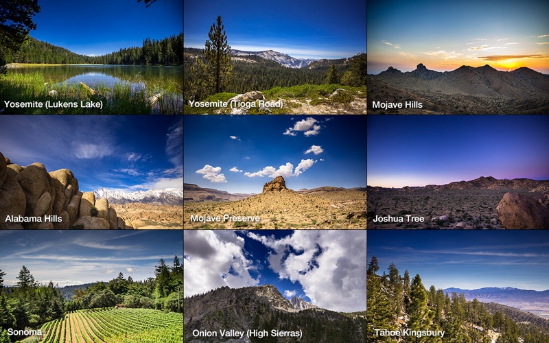 Locations include: Mojave Preserve, Yosemite, Joshua Tree, High Sierras, Grand Canyon, San Francisco, Los Angeles, Malibu, New York, London, Paris, Amsterdam, Tokyo, Sydney, Auckland, Lake Taupo, Iceland, Phuket, and more. Also includes three special painted wallpapers by Waterlogue.