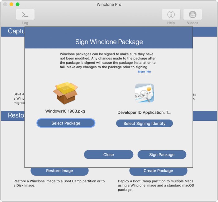 With increased focus on security, signed installer packages can be required in some environments. Using a certificate issued by Apple, Winclone 8 can sign Winclone packages for easy deployments.