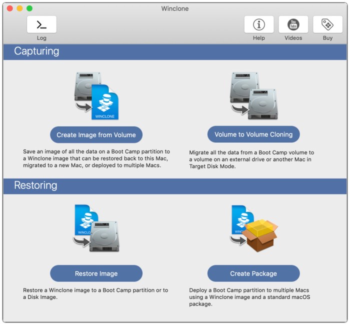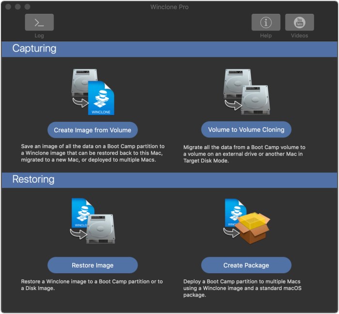 On top of all that, it is very simple and quick to image or restore a Boot Camp partition using Winclone  with the click of a single button, and, because it does that with very low CPU usage ratios, you will also be able to keep working on your projects without noticing any performance degradation.