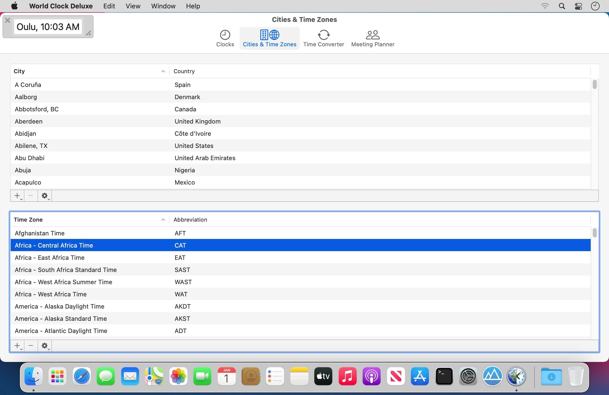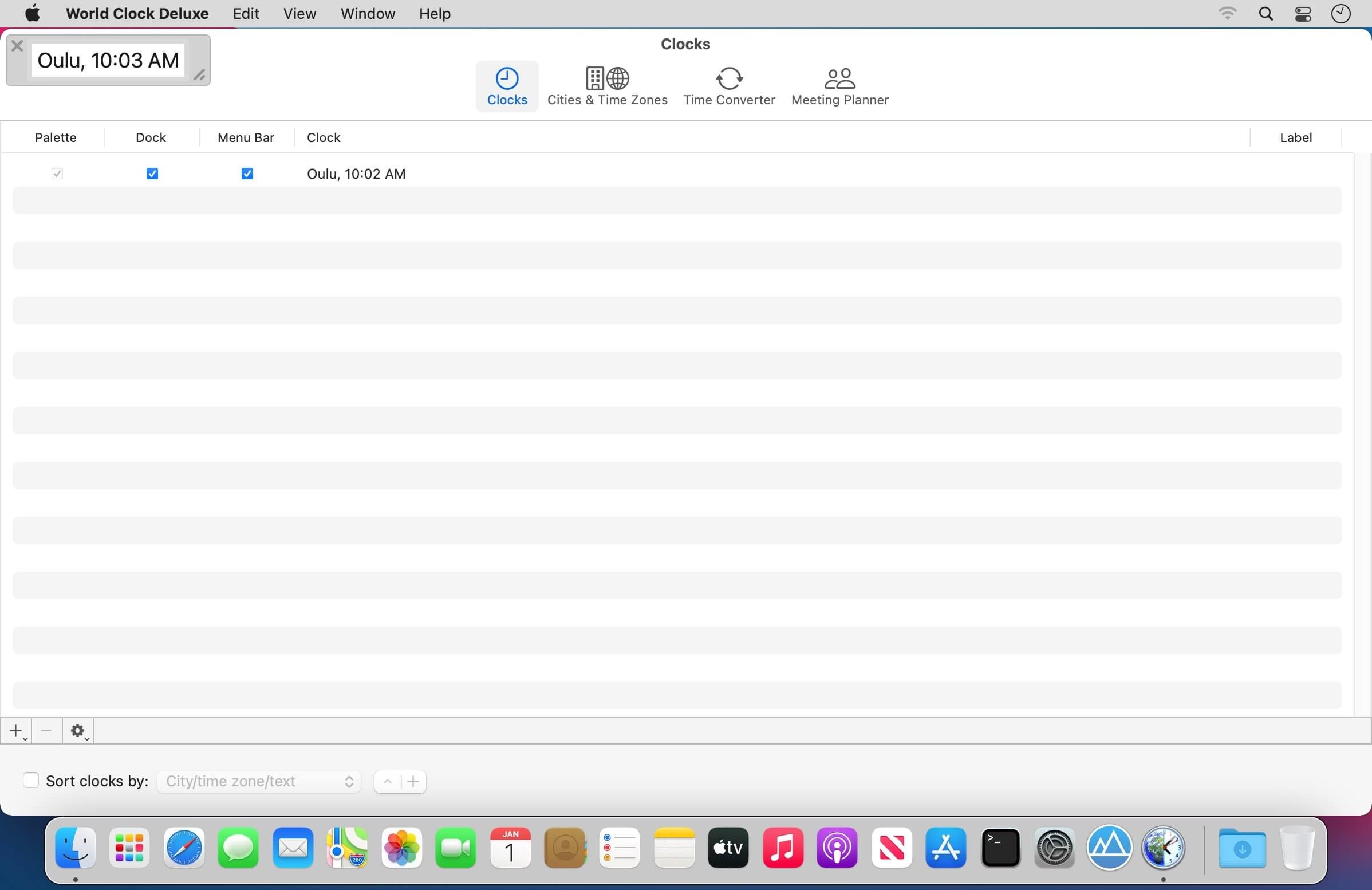 World Clock Deluxe is a reliable and easy-to-use time tool. With World Clock Deluxe you can display multiple clocks in a horizontal or vertical palette, in the menu bar and in the Dock, show Greenwich Mean Time and Coordinated Universal Time, easily identify the best time for conference calls or videoconferences across multiple time zones, quickly calculate time conversions between different cities or time zones, and show the current weather all over the world.